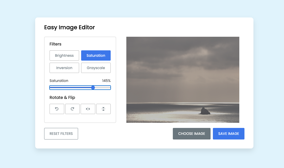 previewImg.style.filter = `brightness(${brightness}%) saturate(${saturation}%) invert(${inversion}%) grayscale(${grayscale}%)`;