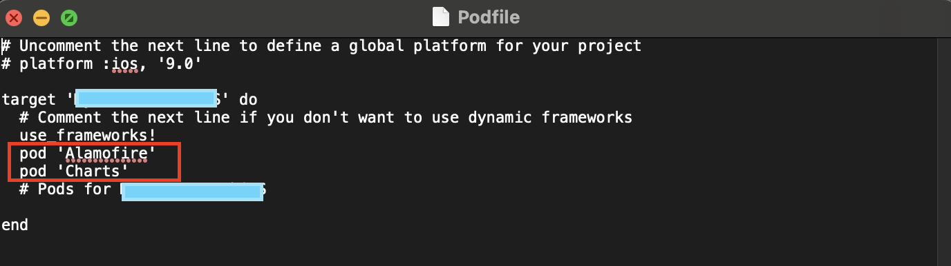 Podfile을 열고 추가하려고 하는 라이브러리를 pod '라이브러리명'으로 입력 후 저장