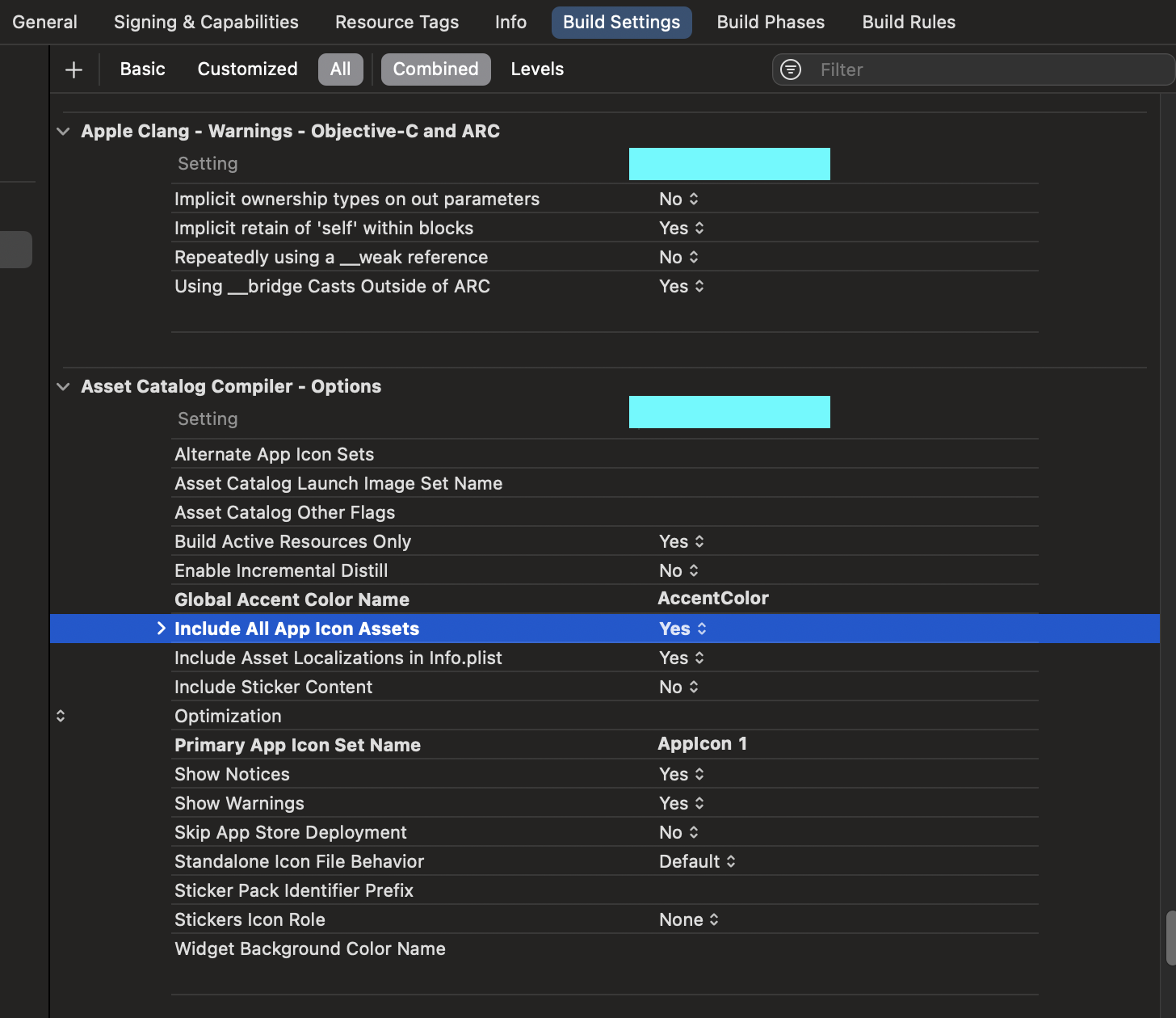 Build Settings 에서 Filter로 Primary App Icon Set Name 검색