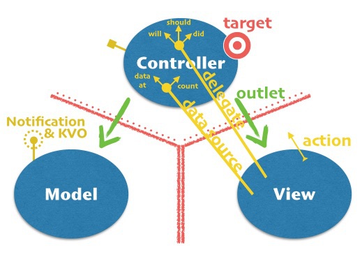 | View - Controller | Controller는 View에 대해 outlet을 이용해 View에게 직접적으로 접근할 수 있습니다. View는 Controller에게 구조적으로 미리 정해진 방식으로 Controller에게 행위에 대한 요청(delegate)과 데이터에 대한 요청(data source)을 할 수 있습니다. 뿐만 아니라, action(View) - target(controller)의 구조로 사용자의 행위에 따라 필요한 함수를 호출할 수 있음 |