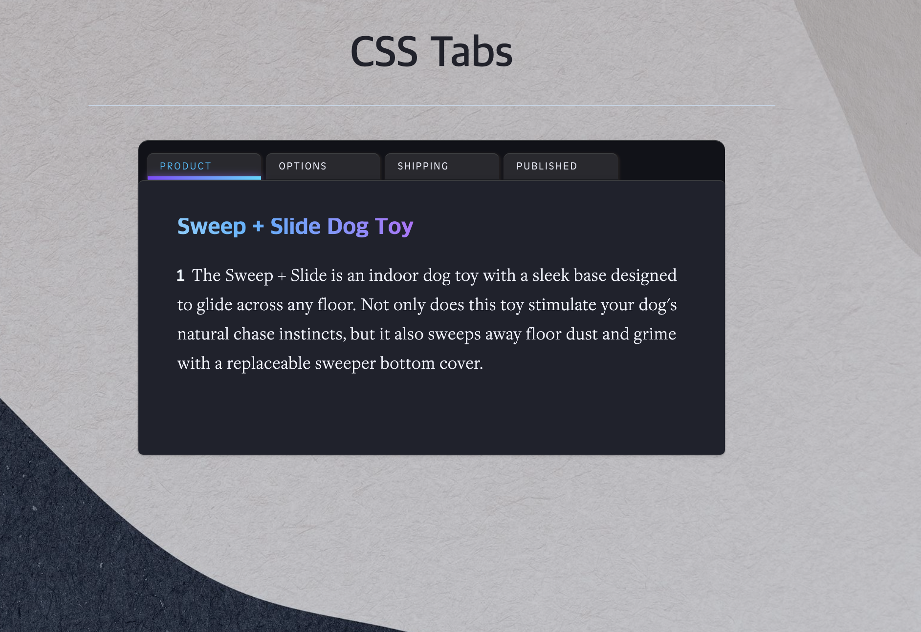 <h2 class="tab-title tab-primary">Sweep + Slide Dog Toy</h2>