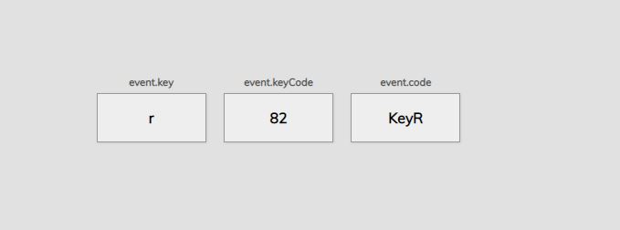 const insert = document.getElementById("insert"); window.addEventListener("keydown", (event) => { insert.innerHTML = ` <div class="key"> ${event.key === " "? "Space" : event.key} <small>event.key</small> </div> <div class="key"> ${event.keyCode} <small>event.keyCode</small> </div> <div class="key"> ${event.code} <small>event.code</small> </div> ` })728x90